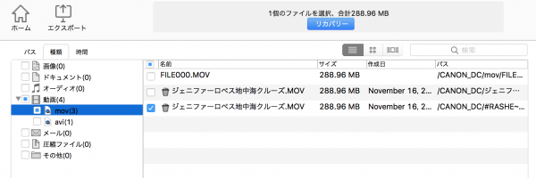 復元したいファイルを指定して、リカバリする。