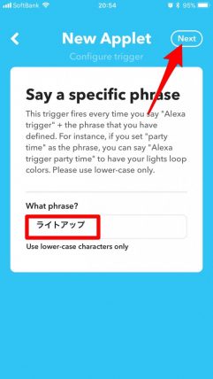 What phrase?の所に、「アレクサ、【ライトアップ】、トリガー」の実行する名前を入れます。
