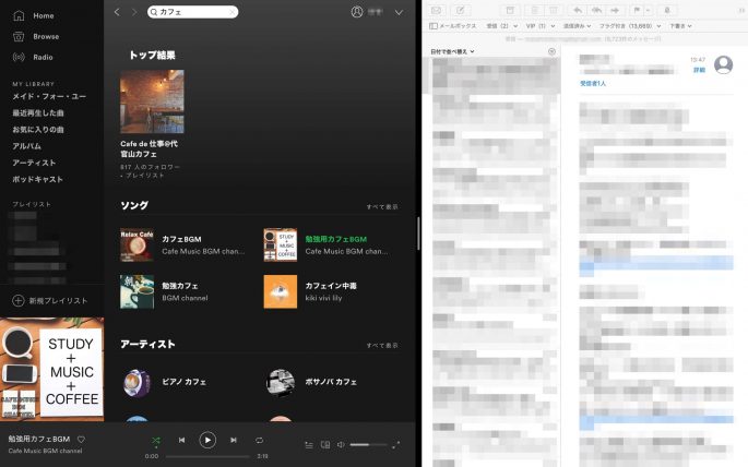仮装デスクトップで、予めメールをSplitViewで開いておきます。