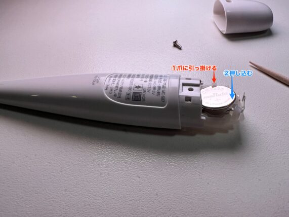 電池の入れ方は爪に引っ掛けて、電池を指で押し込むと簡単にハマります。